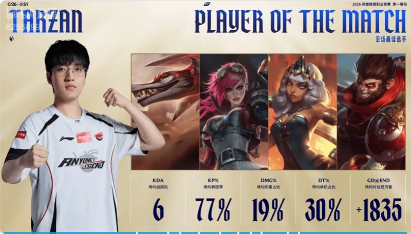 Tarzan以77%的参团率当选AL对阵IG比赛的大场MVP